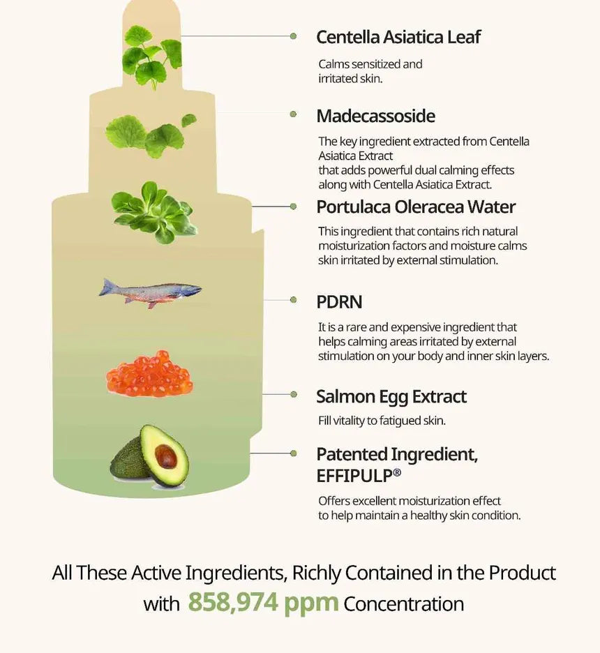 - Formulated with PDRN, Salmon Egg Extract and Centella Asiatica Leaf Water, it soothes the skin.